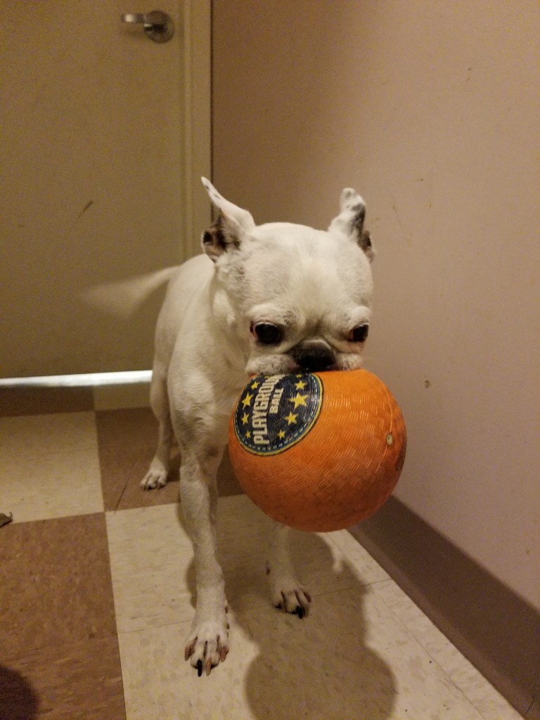 Gizmo was obsessed with attacking balls. I remember being at a friend’s house trying to play basketball, and Gizmo decided the basketball on that day was his nemesis. After a while it was more about Gizmo than the game itself. We’d throw it back and forth and he’d run after it as if his life depended on it. He’s the kind of dog that won’t quit first, we had to make him stop playing for his own good.