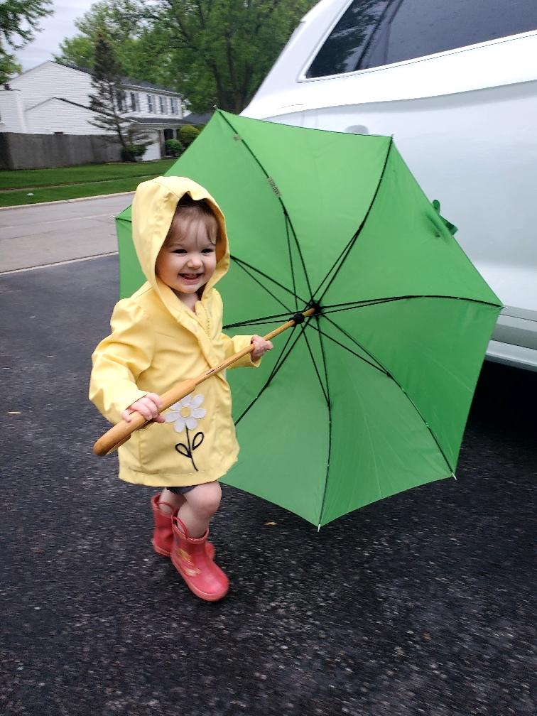 Another cute photo of you. You seem to like playing in the rain, this picture is you playing with Sheri. When we go on walks sometimes you’ll wear rain boots and we’ll seek out puddles for you to get out of the stroller and stomp through.